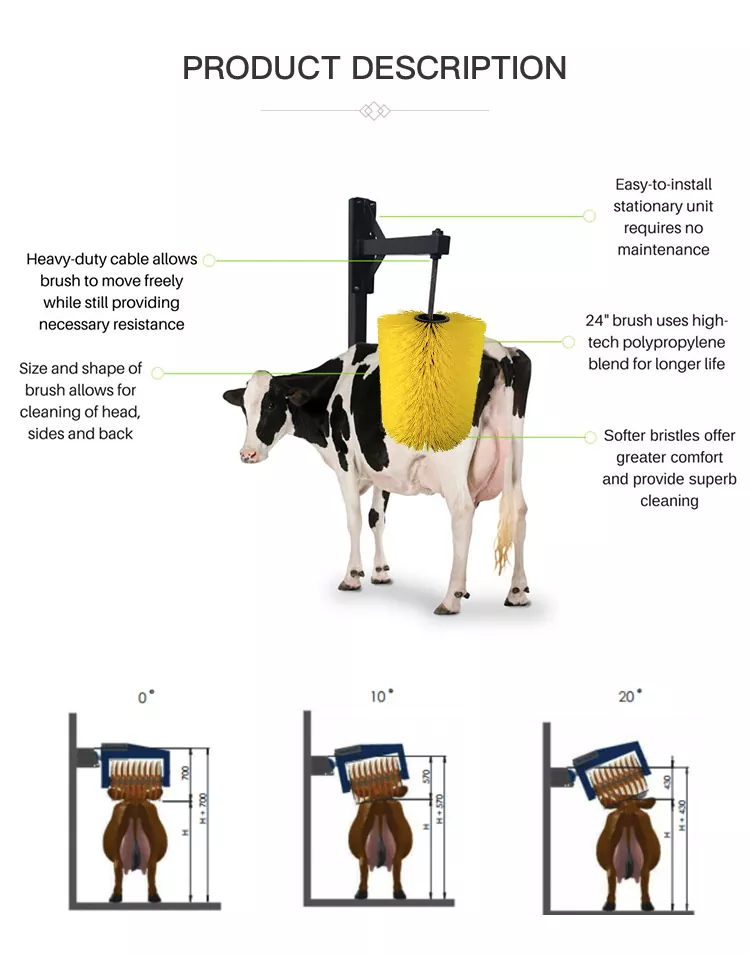 2.Nastaviteľné uhly 0°/10°/20° vyhovujú hospodárskym zvieratám rôznych veľkostí a umožňujú čistenie hlavy, bokov a chrbta.
